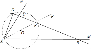 分析 利用圆周角定理构建图形,作∠MAN的平分线AP,且∠MAN=α,在AP上截取AE=b,接着以AE为直径作⊙O,然后以点A为圆心,a为半径画弧交⊙O于D,则∠ADE=90°,再作直线DE交AM于B,交AN于C,则AD为BC边上的高,AE为角平分线.