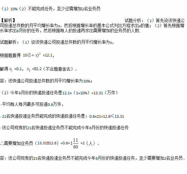 (2)如果平均每人每月最多可投递快递0.6万件,那么该公司现有的21名快递投递业务员能否完成今年4月份的快递投递任务?如果不能,请问至少需要增加几名业务员?