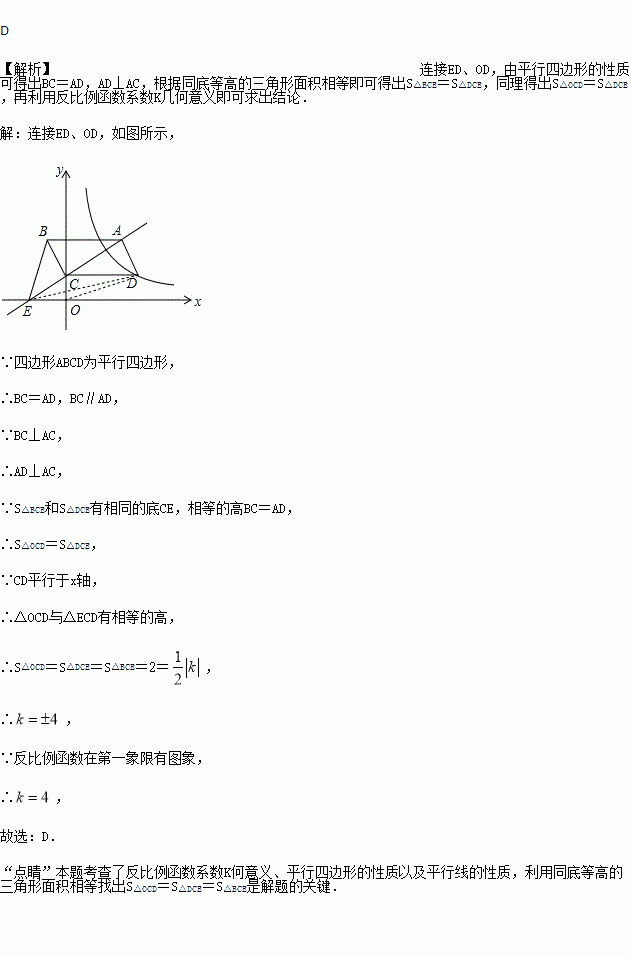 如右图,平行四边形ABCD的顶点C在y轴正半轴上,CD平行于x轴,直线AC交x轴于点E,BC⊥AC,连接BE,反比例函数y=