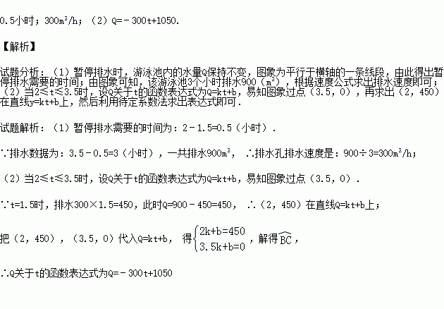 根据卫生防疫部门要求,游泳池必须定期换水,清洗.某游泳池周五早上8:00打开排水孔开始排水,排水孔的排水速度保持不变,期间因清洗游泳池需要暂停排水,游泳池的水在11:30全部排完.游泳池内的水量Q(m2)和开始排水后的时间t(h)之间的函数图象如图所示,根据图象解答下列问题: