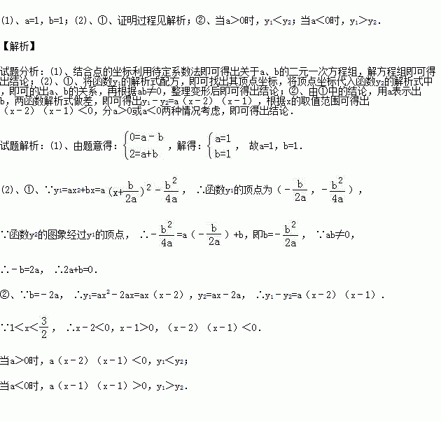 (1)若函数y1的图象过点(﹣1,0),函数y2的图象过点(1,2),求a,b的值.