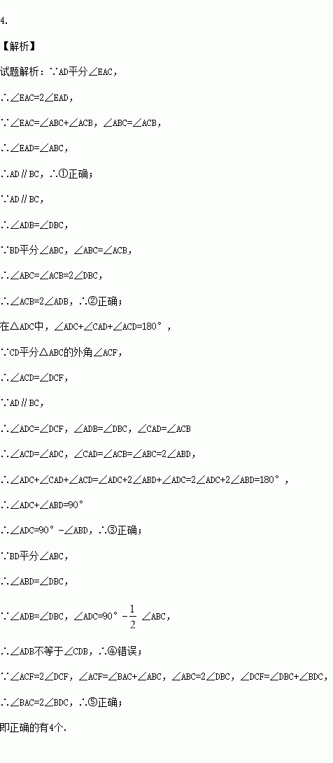 如图,∠ABC=∠ACB,AD、BD、CD分别平分△ABC的外角∠EAC、内角∠ABC、外角∠ACF.以下结论:①AD∥BC;②∠ACB=2∠ADB;③