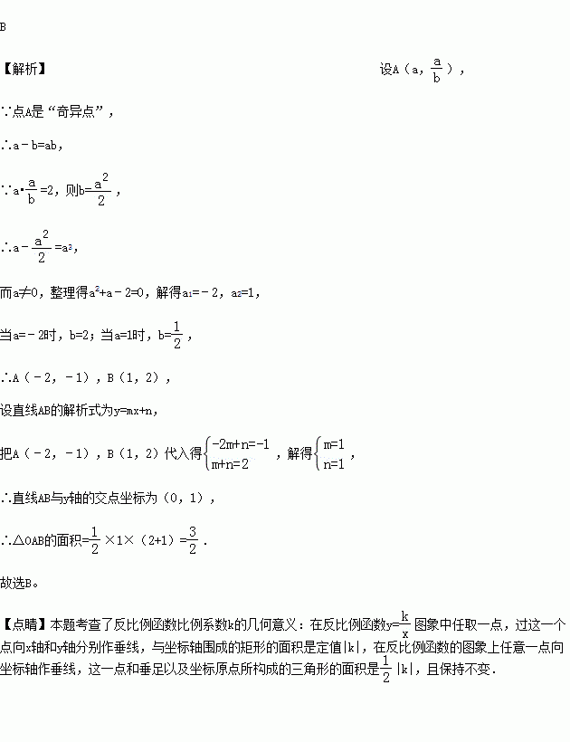)为“奇异点”,已知点A、点B是“奇异点”且都在反比例函数y=的图象上,点O是平面直角坐标系原点,则△OAB的面积为( )