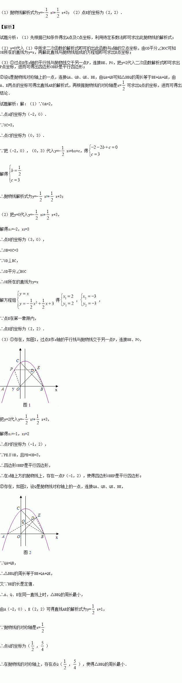 (3)①在x轴上方的抛物线上,是否存在一点P,使四边形OBEP是平行四边形?若存在,求出点P的坐标;若不存在,请说明理由;