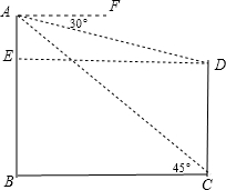 分析:先根据实际问题画出几何图,如图,BC=60m,∠ACB=45°,∠FAD=30°,作DE⊥AB于E,先判断△ABC为等腰直角三角形,得到AB=BC=60,再证明四边形BCDE为矩形得到DE=BC=60;由于∠ADE=∠FAD=30°,在Rt△ADE中根据正切的定义可计算出AE=20