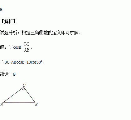 在△ABC中,∠C=90°,∠B=50°,AB=10,则BC的长为( )