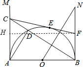 分析 作FH⊥AC于H,如图,设BN=1,则BF=n,半圆的半径为r,根据切线的性质得∠MAB=∠NBA=90°,易得四边形ABFH为矩形,所以HF=2r,AH=BF=n,再根据切线长定理得到CE=CA,FE=FB=n,设CA=t,则CE=t,CH=t-AH=t-n,在Rt△CHF中利用勾股定理得(t-n)2+(2r)2=(t+n)2,解得t=$\frac{{r}^{2}}{n}$,接着证明Rt△BON∽Rt△ACB,然后利用相似比得可计算出n=$\frac{1}{2}$.
