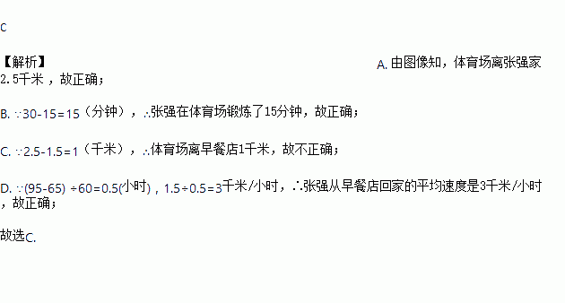 C. 体育场离早餐店4千米 D. 张强从早餐店回家的平均速度是3千米/小时
