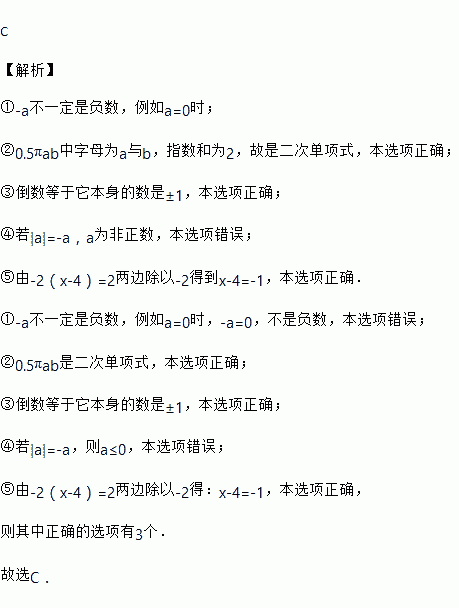 下面说法中 ①﹣a一定是负数;②0.5πab是二次单项式;③倒数等于它本身的数是±1;④若|a|=﹣a,则a<0;⑤由﹣2(x﹣4)=2变形为x﹣4=﹣1,其中正确的个数是( )
