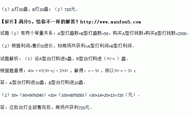 (2)若A型台灯按标价的9折出售,B型台灯按标价的8折出售,则这批台灯全部售出后,商场共获利多少元?