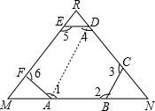 (2)由(1)可知∠1=∠4,结合条件可得到∠6+∠1,在△AFM中可求得∠M,在△RMN中可求得∠R+∠N.