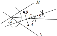 解答 解:如图所示:作∠NOM的角平分线和线段AB的中垂线,它们的交点为C,则C点就是英语角的位置.