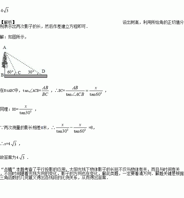 如图,校园内有一棵与地面垂直的树,数学兴趣小组两次测量它在地面上的影子,第一次是阳光与地面成60°角时,第二次是阳光与地面成30°角时,两次测量的影长相差8米,则树高_____________米(结果保留根号).
