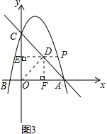 (3)连接OD,由题意知,矩形OFDE的对角线相等:OD=EF,据垂线段最短,可知:当OD⊥AC时,OD最短,即EF最短.由勾股定理和三角形中位线定理易推知:$DF=\frac{1}{2}OC=2$,所以点P的纵坐标是2.最后根据二次函数图象上点的坐标特征来求点P的横坐标即可.