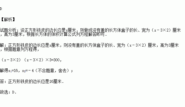 将一块正方形铁皮的四角各剪去一个边长为3cm的小正方形,做成一个无盖的盒子,已知盒子的容积为300cm3,则原铁皮的边长为( )