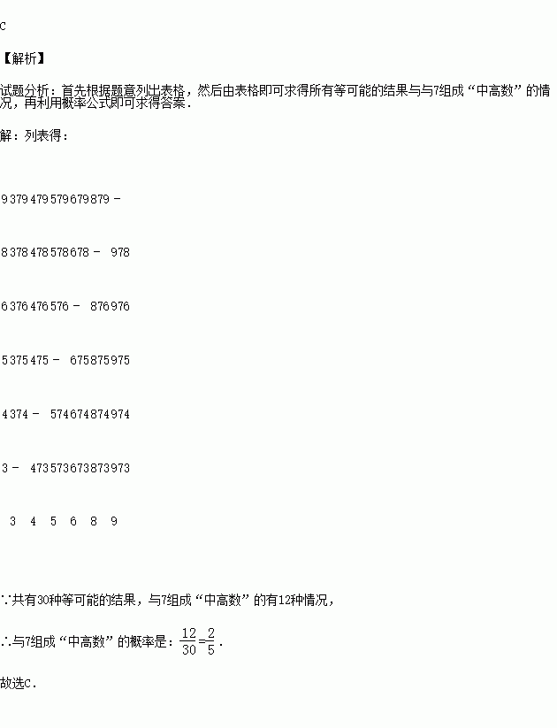 (2015•泰安)若十位上的数字比个位上的数字、百位上的数字都大的三位数叫做中高数,如796就是一个“中高数”.若十位上数字为7,则从3、4、5、6、8、9中任选两数,与7组成“中高数”的概率是( )