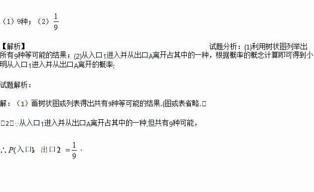(1)用树状图表示,小明从进入到离开,对于入口和出口的选择共有多少种不同的结果?