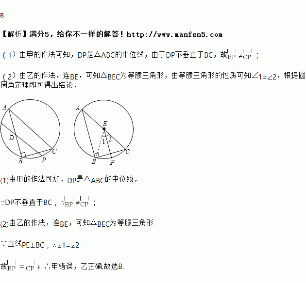 甲:①取 AB 的中点 D:②过点 D 作直线 AC 的平行线,交