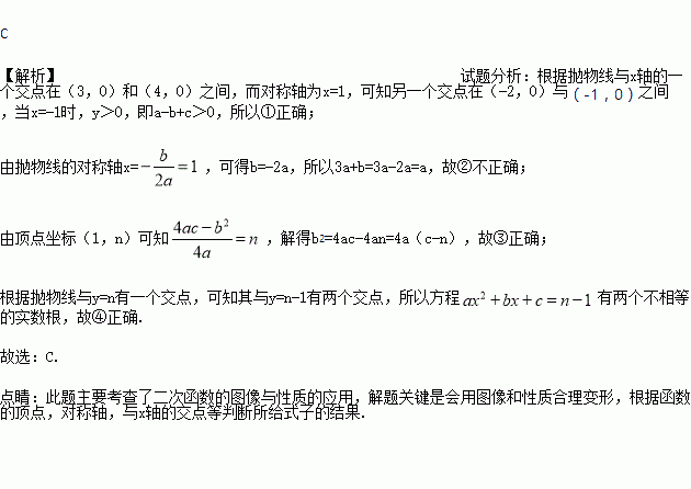 的部分图象,其顶点坐标为(1,n),且与x轴的一个交点在点(0 ,3)和(0 ,4)之间.则下列结论: ①