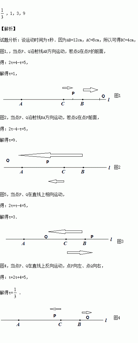 如图, 已知点A、点B是直线上的两点,AB =12厘米,点C在线段AB上,且AC=8厘米.点P、点Q是直线上的两个动点,点P的速度为1厘米/秒,点Q的速度为2厘米/秒.点P、Q分别从点C、点B同时出发,在直线上运动,则经过 秒时线段PQ的长为5厘米.