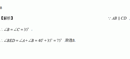 如图,AB∥CD,AD 与 BC 相交于点 E,若∠A=40°,∠C=35°,则∠BED=( )