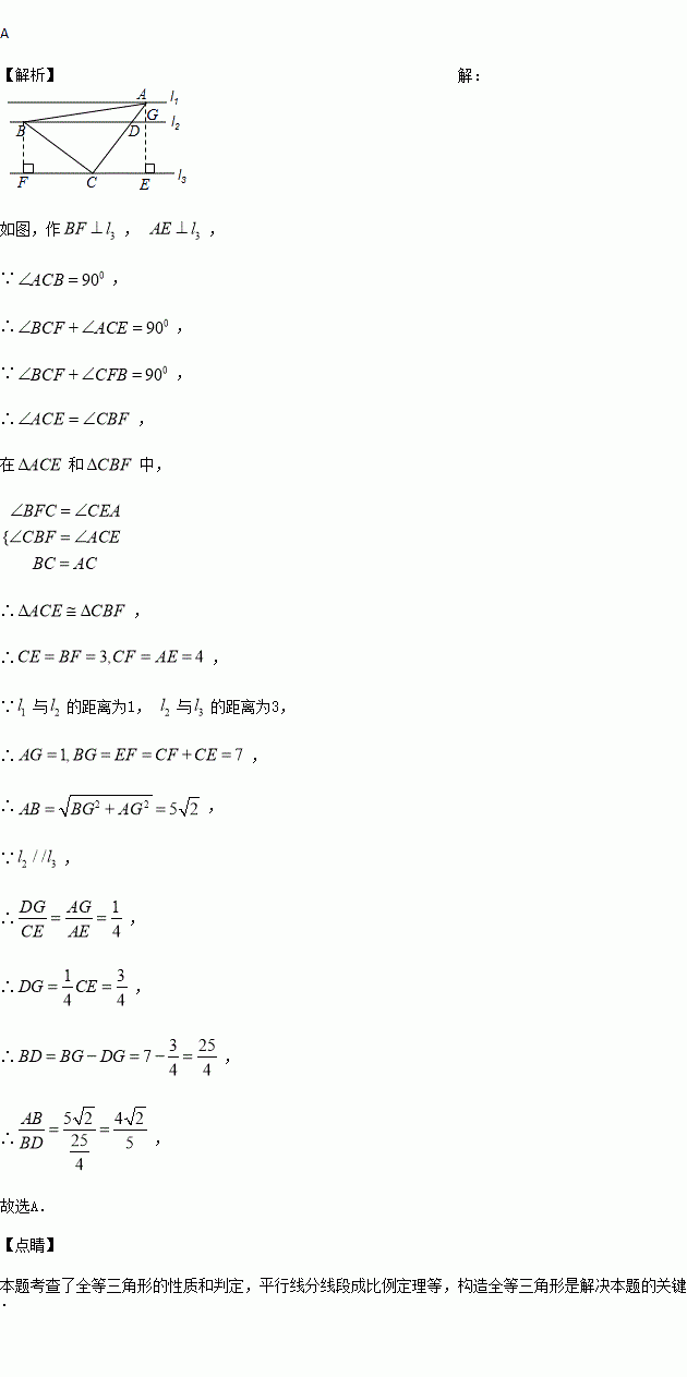 如图,直线l1∥l2∥l3,等腰Rt△ABC的三个顶点A,B,C分别在l1,l2,l3上,∠ ACB=90°,AC交l2于点D,已知l1与l2的距离为1,l2与l3的距离为3,则AB:BD的值为( )