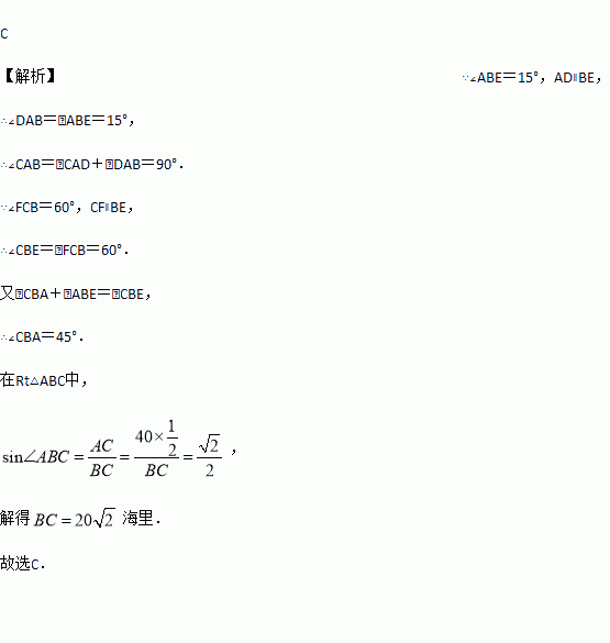 如图,在某监测点B处望见一艘正在作业的渔船在南偏西15°方向的A处,若渔船沿北偏西75°方向以40海里/小时的速度航行,航行半小时后到达C处,在C处观测到B在C的北偏东60°方向上,则B、C之间的距离为( )