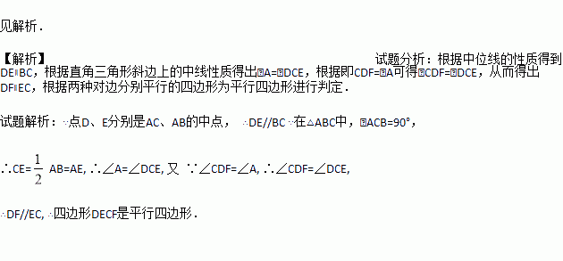 已知:如图,△ABC中,∠ACB=90°,点D、E分别是AC、AB的中点,点F在BC的延长线上,且∠CDF=∠A.求证:四边形DECF是平行四边形.