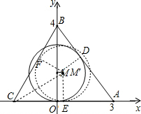 分析 先利用勾股定理计算出AB=5,作MD⊥AB于D,设⊙M的半径为R,则OM=r,BM=4-r,根据切线的性质得MD=r,通过证明△BMD∽△BAO得到$\frac{MD}{OA}$=$\frac{BM}{BA}$,可求出解得r=$\frac{3}{2}$,即OM=$\frac{3}{2}$,接着在Rt△BOC中,利用∠BCO的正切可求出OC=$\frac{4\sqrt{3}}{3}$,将⊙M向右平移到⊙M′,使⊙M′与BC相切,如图,作M′E⊥x轴于E,M′F⊥BC于F,连结CM′,易得四边形OMM′E为矩形,则MM′=OE,M′E=OM=$\frac{3}{2}$,根据切线长定理得到∠ECM′=30°,在Rt△ECM′中,利用∠ECM′得正切可计算出CE=$\frac{3\sqrt{3}}{2}$,则OE=CE-OC=$\frac{\sqrt{3}}{6}$,所以MM′=$\frac{\sqrt{3}}{6}$,即保持圆的大小不变,△ABC位置不变,将⊙M向右平移$\frac{\sqrt{3}}{6}$个单位,⊙M与BC相切.