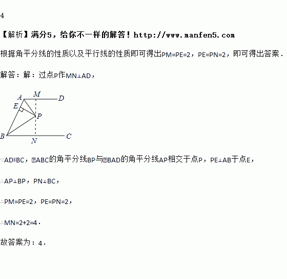 如图,AD∥BC,∠ABC的角平分线BP与∠BAD的角平分线AP相交于点P,作PE⊥AB于点E.若PE=2,则两平行线AD与BC间的距离为_____.