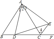 分析:由等边三角形的性质可以得出∠BAC=∠B=∠ACB=60°,AB=AC.由条件证明△ABD≌△ACE就可以得出AD=AE,∠1=∠3,得出∠DAE=60°就可以得出△ADE为等边三角形.