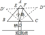 分析:设三角形的小岛为△ABC,桥与小岛的连接处为D点,作D点的关于AB对称点D′,作D点的关于AC对称点D″,连接D′D″,交AB于E,交AC于F,在D、E、F就是所求的点;此时△DEF的周长最小,使每天取样所用的时间最短.