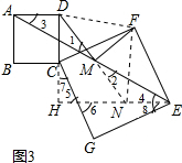 ∴∠DCF=∠NEF=45°,在△FDC好△FNE中,$\left\{\begin{array}{l}{DC=NE}&{\;}\\{∠DCF=∠NEF}&{\;}\\{FC=FE}&{\;}\end{array}\right.$,