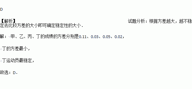 甲、乙、丙、丁四位运动员在“110米栏”训练中,每人各跑5次,据统计,平均成绩都是13.2秒,方差分别是S甲2=0.11,S乙2=0.03,S丙2=0.05,S丁2=0.02,则这四位运动员“110米栏”的训练成绩最稳定的是( )