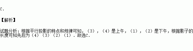 如图是滨河公园中的两个物体,一天中四个不同时刻在太阳光的照射下落在地面上的影子,按照时间的先后顺序排列正确的是( )