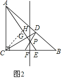 (2)如图2,作∠ACB的角平分线交AP于H,于是得到∠BCH=∠ACH=45°根据等腰直角三角形的性质得到∠B=45°由于P为BC的中垂线MN上一点,E,F关于l对称,于是得到CE=BF,PE=PF,求得∠PEF=∠PFE,推出△CEH≌△BFD(ASA)根据全等三角形的性质得到EH=FD,通过△ACH≌△CBD得到AH=CD,即可得到结论.