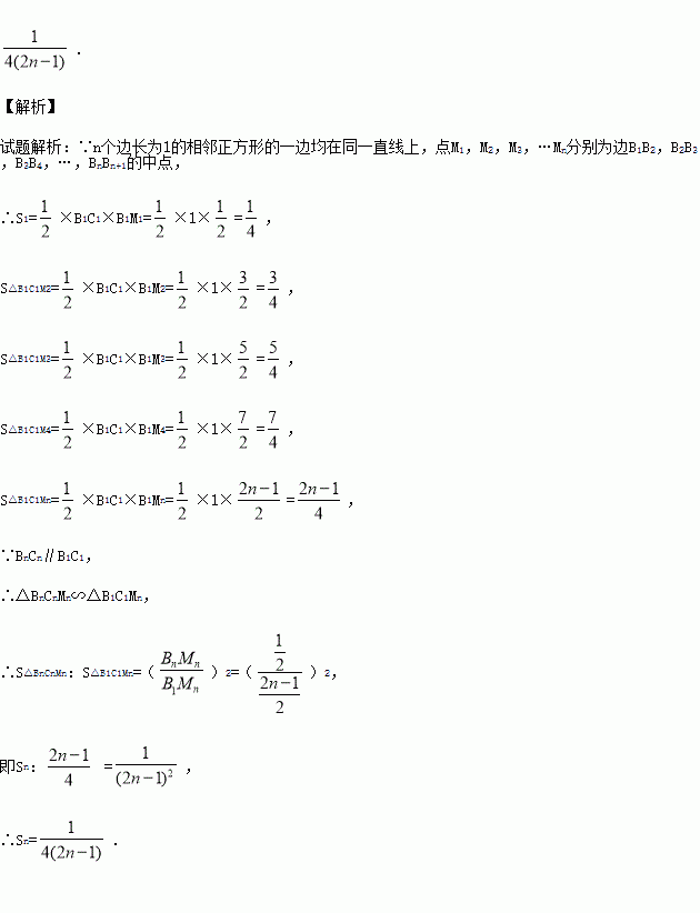 如图,n个边长为1的相邻正方形的一边均在同一直线上,点M1,M2,M3,…Mn分别为边B1B2,B2B3,B3B4,…,BnBn+1的中点,△B1C1M1的面积为S1,△B2C2M2的面积为S2,…△BnCnMn的面积为Sn,则Sn= .(用含n的式子表示)