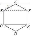 解答 解:连接BF,∵六边形ABCDEF是正六边形,∴BF∥CE,AB=AF,∠BAF=120°,∴∠AFB=$\frac{180°-120°}{2}$=30°,∵直线l∥CE,∴直线l∥BF,∴∠1=∠ABF=30°.故答案为:30°.