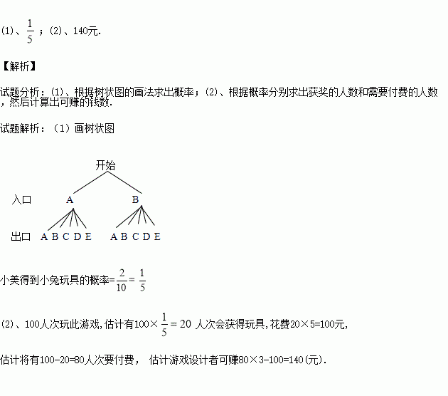 小美周末来到公园,发现在公园一角有一种“守株待兔”游戏.游戏设计者提供了一只兔子和一个有A、B、C、D、E五个出入口的兔笼,而且笼内的兔子从每个出入口走出兔笼的机会是均等的. 规定①玩家只能将小兔从A、B两个出入口放入,②如果小兔进入笼子后选择从开始进入的出入口离开,则可获得一只价值5元小兔玩具,否则应付费3元.