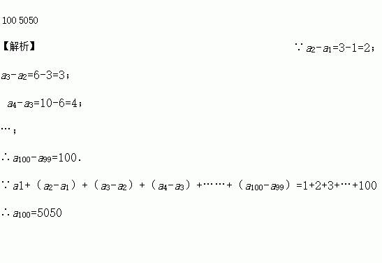古希腊数学家把数1,3,6,10,15,21……叫做三角形数,它有一定的规律性.若把第一个三角形数记为a1,第二个三角形数记为a2,……,第n个三角形数记为an,计算a2-a1,a3-a2,a4-a3,……,由此推算,a100-a99= ____________,a100=__________.