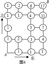 方法二:如图4:由于交叉点C道路施工,禁止通行,故视为相邻道路不通,可删除与C点紧相连的线段,运用分类加法计数原理,算出从A点到B点并禁止通过交叉点C的走法有17种.从A点到各交叉点的走法数,