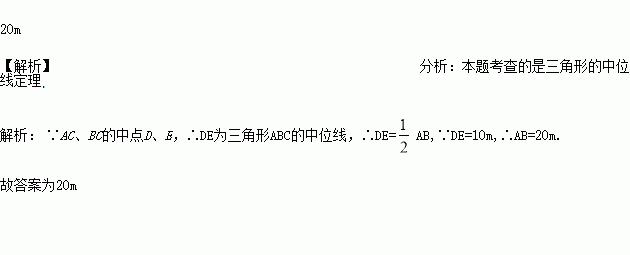如图,A、B两点分别位于一个池塘的两端,小聪想用绳子测量A、B间的距离,但绳子不够长,一位同学帮他想了一个主意:先在地上取一个可以直接到达A、B的点C,找到AC、BC的中点D、E,并且测出DE的长为10m,则A、B间的距离为______________.
