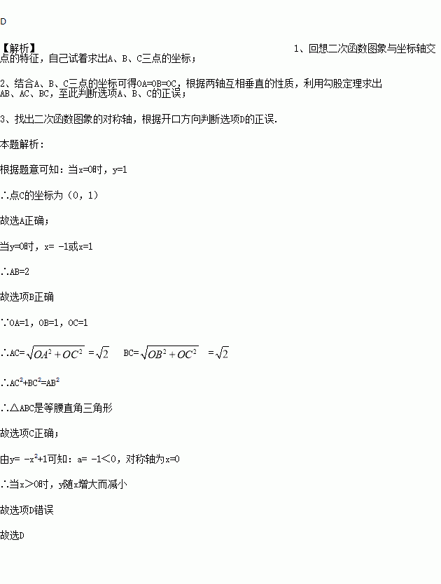二次函数y=﹣x2+1的图象与x轴交于A、B两点,与y轴交于点C,下列说法错误的是( ).