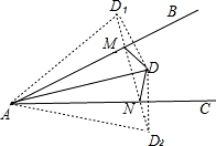 分析 作点D关于AB对称的点D1,作点D关于AC对称的点D2,连接D1D2,与AB交于点M,与AC交于点N,此时△DMN的周长最小,然后根据∠BAC=30°,求得∠D1AD2=60°,进而证得△AD1D2是等边三角形.从而求得D1D2=AD1=AD=4cm.