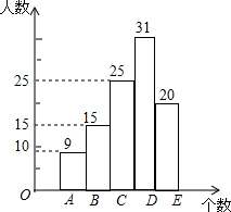 分析 (1)根据B组的人数是15,所占的百分比是15%即可求得调查的总人数,然后根据百分比的意义求得D组合E组的人数,补全直方图;