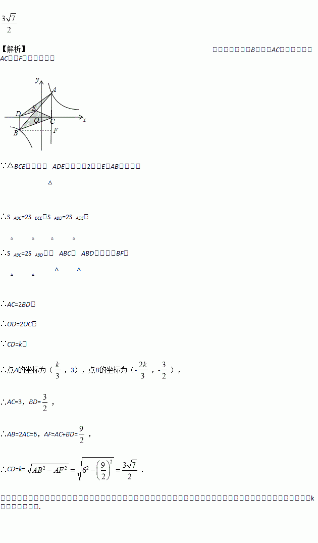 (k>0)的图象上,AC⊥x轴,BD⊥x轴,垂足C,D分别在x轴的正、负半轴上,CD=k,已知AB=2AC,E是AB的中点,且△BCE的面积是△ADE的面积的2倍,则k的值是______.