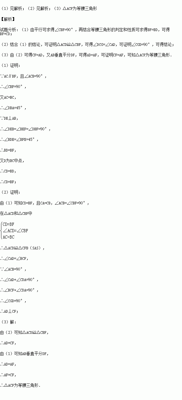 (2015秋•临清市期末)如图,在等腰Rt△ABC中,∠ACB=90°,D为BC的中点,DE⊥AB,垂足为E,过点B作BF∥AC交DE的延长线于点F,连接CF.
