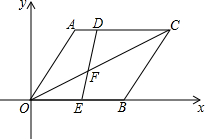 如图,四边形AOBC是菱形,点B坐标为(8,0),∠AOB=60°,点D从点A开始以每秒1个单位长度的速度沿AC向点C移动,同时点E从点O开始以每秒x(1≤x≤4)单位长度的速度沿射线OB向右移动,设t(1≤t≤8)秒后,DE交OC于点F.