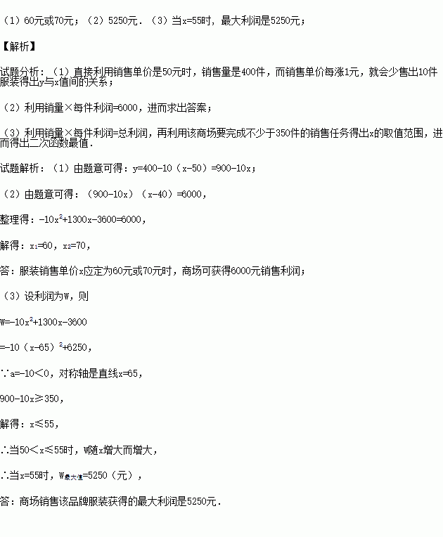 (3)在(1)问条件下,若该商场要完成不少于350件的销售任务,求商场销售该品牌服装获得的最大利润是多少?