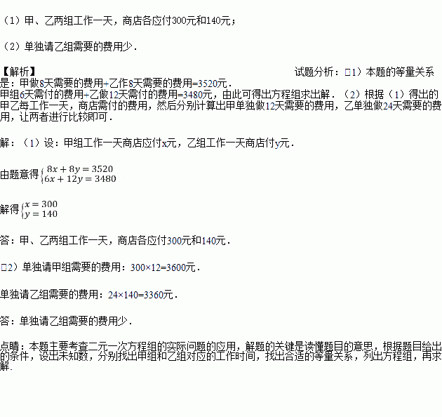 (2)已知甲组单独做需12天完成,乙组单独做需24天完成,单独请哪组,商店所付费用最少?